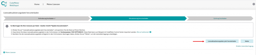 Klicken Sie auf die Schaltfläche „Lizenzaktualisierungs-Datei jetzt herunterladen“ und wählen Sie anschließend die Option „Datei speichern“.