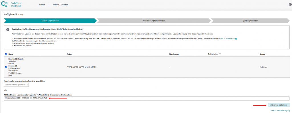 Geben Sie hier den Namen der zuvor erzeugten Lizenzanforderungs-Datei ein und klicken Sie dann auf die Schaltfläche „Aktivierung jetzt starten“. Dadurch wird eine Lizenzaktualisierung-Datei (*.WibuCmRaU) erzeugt.