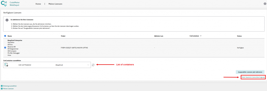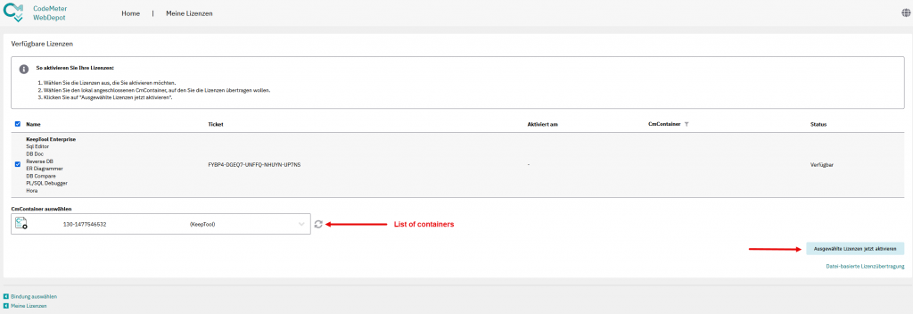 Wählen Sie den Container „KeepTool“ an und klicken Sie auf „Lizenzaktualisierung“. Dadurch wird der sogenannte CmFAS-Assistent gestartet: